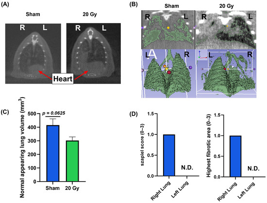 Prior to euthanasia, the extent of tissue damage was evaluated using CBCT imaging. Qualitative analysis of the CBCT images revealed evidence of opacities consistent with lung injury (Figure 3A). CBCT images were quantitatively analyzed to further assess potential radiographic evidence of injury using an automated image threshold approach in Slicer 3D software to generate the NALVs (Figure 3B). Three-dimensional reconstruction of the NALV reveals a loss of anatomical structure in the irradiated lung. Moreover, there was a decrease in NALV trending towards statistical significance in irradiated mice as compared to sham controls (302.6 ± 26.2 versus 416.0 ± 45.6 mm3, p = 0.0625 Figure 3C). Following euthanasia, lung tissue harvested from the irradiated mice was stained with H&E and trichrome to characterize long-term pathology, with the unirradiated (left) lungs being used as an internal control. To characterize the onset of fibrosis, the Szapiel score was used [26], where the irradiated right lung showed mild fibrotic onset (Szapiel score = 1), which was not apparent in the left lung (Szapiel score = 0) (Figure 3D). Similarly, the highest fibrotic score revealed the same trend (Figure 3D). Thus, it appears that we were able to induce pathologic radiation-induced changes in the irradiated right lung while sparing the left lung, allowing it to serve as an internal control.