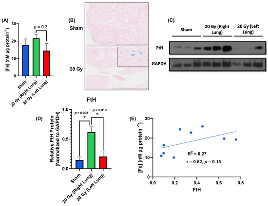 Following model validation, iron accumulation was evaluated. Using a ferrozine-based detection method, an increase in iron content was observed in the irradiated lungs compared to both sham and internal unirradiated controls (mean = 17.68, 21.64, and 14.57 Fe µg protein −1, respectively, Figure 4A). Due to limited sample availability (n = 3 per treatment), differences in [Fe] were not statistically significant between sham controls and right lungs (p = 0.7) or spared left lungs and right lungs (p = 0.3); however, this trend was consistent with previous studies in the literature showing increased iron content following irradiation [11,35,36,37]. Furthermore, we confirmed these findings on iron accumulation via Prussian blue staining, where only irradiated lungs showed evidence of Prussian-blue-positive cells (Figure 4B). Moreover, FtH levels in the right lung were significantly higher compared to sham controls and the spared left lungs (p = 0.001, p = 0.018, respectively) (Figure 4C,D), consistent with the induction of FtH in response to increased tissue iron content. Our data showed a trend of positive correlation (R2 = 0.27, r = 0.5, p = 0.15) between [Fe] and FtH protein levels (Figure 4E). Although not statistically significant (p = 0.15), this finding is consistent with previous studies showing the relationship between FtH and [Fe] [38,39]. Therefore, it appears that ionizing radiation can stimulate long-term iron accumulation in lung tissue.