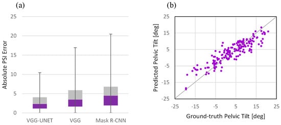 - Cascaded networks with independent learning (Mask R-CNN): This experiment is meant to compare the proposed method with the state-of-the-art method [14] for PT estimation from a single radiography image. It has been shown that employing the Mask R-CNN instead of the standard U-Net for pelvic segmentation improves efficiency in terms of the Dice coefficient. So firstly, the Mask R-CNN framework was employed to segment the pelvic shape from the background in the radiography images. Then, following the segmentation network, another convolutional network regressed the PT angle. All networks’ structures and hyper-parameters were set according to the original paper. For convenience, we refer to the cascaded network as its segmentation network name, i.e., Mask R-CNN.