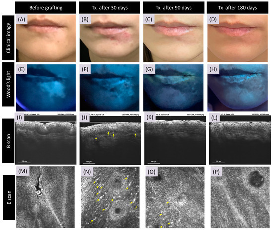 Cellular-resolution full-field oct features of rejected skin grafting in vitiligo. This figure portrays the effects of skin grafting on a vitiligo lesion through the lens of cellular-resolution full-field optical coherence tomography (CRFF-OCT). The presented case demonstrates a grafting procedure resulting in reduced melanin content—a situation categorized as a rejected case—accompanied by immunocytes along the dermato-epidermal junction (DEJ). Before grafting, the image portrays a vitiligo lesion situated upon the forehead. (A,E). The CRFF-OCT reveals the presence of highly refractive inflammatory cells within the papillary dermis (I,M). Following 30 days, the CRFF-OCT exposes a limited number of melanocytes (highlighted by the ➚ arrow) at the DEJ (B,F,J,N). Progressing to 90 days post grafting, the pigmentation restoration at the lesion site indicates a rejected graft (K,O). After treatment with azathioprine 50 mg/day for 90 days, repigmentation with papillary rings, melanocytes, and melanin deposition was found (L,P). Also, between days 90 and 180 post-grafting, notable repigmentation occurred in the lesion during azathioprine administration, (C,D,G,H).
