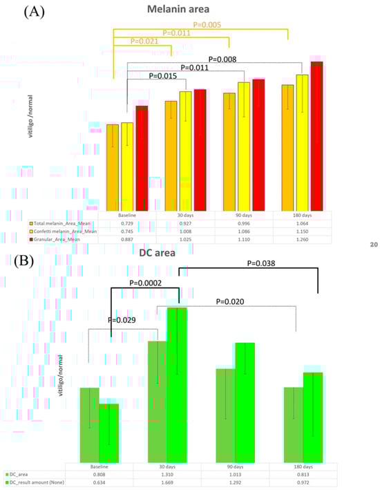 Descriptive statistics succinctly summarized the demographic and clinical features of the study participants. Continuous variables were presented as means ± standard deviations, while categorical variables were expressed as frequencies and percentages. To evaluate the pigment ratio, we divided the pigment area within the lesion by the corresponding area in normal skin. Prism software (Version 10 GraphPad, San Diego, CA, USA) conducted statistical analyses post data collection and preprocessing. To detect changes in melanin area over time, we used paired sample t-tests, comparing melanin areas within the lesion and normal skin regions at basal layers across four-time points: baseline, 30, 90, and 180 days. Significance was defined as a two-sided p-value < 0.05.