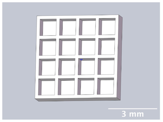Chitubox screengrab of 5 mm × 5 mm × 1 mm square lattice model with 16 square-shaped pores 800 μm deep 200 μm interstitial wall space (oblique view). This construct was designed to provide large surface area and both oxygenated (thin-walled) and oxygen-depleted (thick-walled) areas for growth of facultative anaerobic bacteria, such as P. fluorescens.