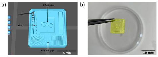 To test the printability of gelatin-PEGDA hydrogel, a designed model containing several validation shapes was printed: (a) labelled Chitubox screengrab of XP2 Validation Matrix Model (modified from 3D Printerly, 2023); (b) the printed Validation Matrix Model.