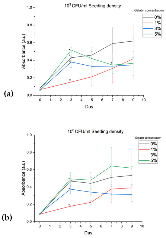 Figure 5a shows that absorbance of all concentrations of gelatin increased significantly from Day 0 to Day 3 for the 103 CFU/mL P. fluorescens seeding density (0%, p = 0.008; 1%, p = 0.020; 3%, p = 0.013; 5%, p = 0.002). The 0% gelatin hydrogel demonstrated the greatest absorbance reading at Day 9. The 1% gelatin hydrogel had continuous and consistent upwards growth compared with all other gelatin concentrations over the 9 days and did not decline or plateau. Absorbance in the 3% and 5% gels faltered after Day 5. Figure 5b shows that absorbance of all concentrations of gelatin increased significantly from Day 0 to Day 3 for the 108 CFU/mL P. fluorescens seeding density (0%, p = 0.008; 1%, p = 0.004; 3%, p = 0.012; 5%, p = 0.011). The 5% gelatin hydrogel demonstrated the greatest absorbance reading at Day 9. The 1% gelatin concentration displayed steadily increasing absorbance before plateau between Day 7 and Day 9. The 3% gelatin hydrogel faltered after Day 3.