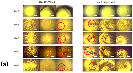 Digital microscopy images were recorded on Days 0, 3, 5, 7, and 9 for a visual inspection of bacterial growth. Images are presented below for each of the 0%, 1%, 3%, and 5% hydrogels and 103 CFU/mL and 108 CFU/mL seeding density of P. fluorescens, in triplicate (Figure 6). Figure 6a demonstrates an increased optical density of the 103 CFU/mL seeded hydrogels compared to the 108 CFU/mL hydrogels, suggested by a comparatively dull appearance. In the 1% gel (Figure 6b), bacterial colonies are seen more in the 108 CFU/mL seeded gel than in the 103 CFU/mL seeded gel. In the 3% gel (Figure 6c), there are no larger bacterial aggregates and no apparent differences between the two seeding densities. Both seeding densities of 5% gelatin hydrogel mixtures appear to have had considerable bacterial growth (Figure 6d).