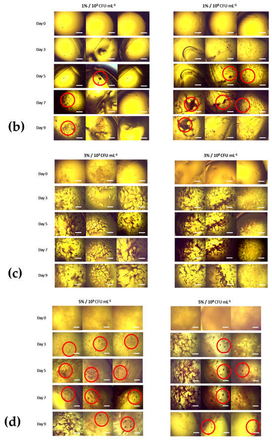 Triplicate digital microscope images of (a) 0% (b) 1% (c) 3% (d) 5% w/v gelatin-PEGDA hydrogels at seeding densities of 103 and 108 CF/mL and Days 0, 3, 5, 7, and 9 of culture (10× magnification). Bacterial aggregates with morphology consistent with biofilm formation are highlighted in red. Scale bar is 250 µm.