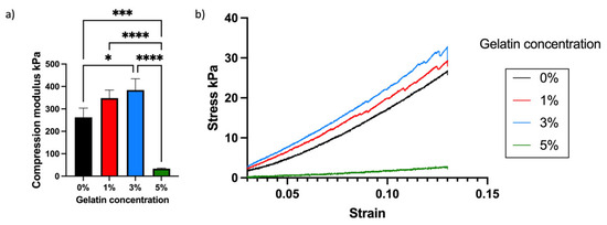 Compression modulus (a) and stress–strain curve (b) of different gelatin-PEGDA hydrogels, demonstrating significant difference in compression modulus and stress between the 0% and 3% gels, and for the 5% gel in comparison to all other gels. The compression moduli were 262.3 ± 41.3, 348 ± 36.05, 383.9 ± 50.27, and 33.51 ± 2.67 kPa (for 0%, 1%, 3%, and 5% respectively), with asterisks (*, ***, ****) signifying independent significant differences.
