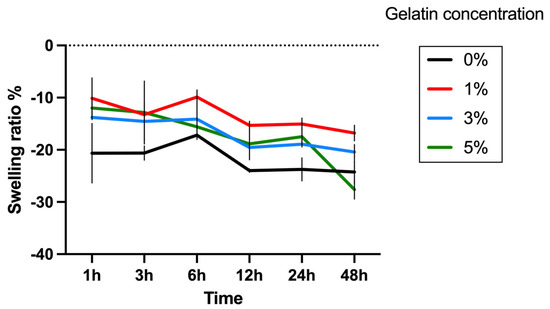 A variation in visco-elastic properties of gelatin-PEGDA hydrogels, depending on the component ratio, has been reported previously [28]. In the present study, the compression modulus was significantly greater in the 3% compared to the 0% gel, implying that the addition of gelatin strengthened the gel (Figure 8). It is hypothesised that the significantly reduced modulus in the 5% gel (Figure 9) was due to the swelling of uncrosslinked gelatin disrupting the structure after immersion in PBS. The 1% gel demonstrated the least percentage mass loss, suggesting superior preservation of the hydrogel matrix (Figure 10). The presence of uncrosslinked gelatin is consistent with the comparatively greater gelatin release seen in the 5% gel as measured by the BCA assay (Figure 11). Degradation testing (Figure 12) demonstrated a structural failure of the 0% gel, but the favoured 1% gel was able to maintain structure during incubation in PBS. We conclude that the addition of between 1% and 3% gelatin to PEGDA is sufficient to improve the compression modulus, swelling ratio, gelatin release, and degradation. In summary, the addition of gelatin enhances the mechanical properties of PEGDA hydrogels.