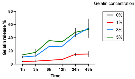 Gelatin release as a percentage of gelatin detected by BCA assay compared to mass of gelatin printed for each hydrogel formulation. The 1% gel demonstrated far less gelatin release compared to the 3% and 5% gels. The 0% gel was not included in this assay as it does not contain any gelatin.