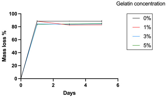 Percentage mass loss of hydrogels at 0–5 days. The mass loss after lyophilization is around 80%, reflecting the high water content with a low mass fraction of polymer found in hydrogels. The 0% gelatin gels demonstrated slightly greater percentage of mass loss than the gels with gelatin.