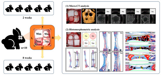 Four circular defects measuring 8 mm in diameter were created in the calvarium of each rabbit using the same method as in previous studies [26,27]. Two different types of synthetic bone substitutes, in powder and granular form, respectively, were applied to the calvarial defects. In the groups using a barrier membrane, a resorbable collagen membrane (Bio-Gide®, Geistlich Pharma AG, Wolhusen, Switzerland; LOT number 82100857) was cut into the size of 10 mm × 10 mm and placed over each defect. As a result, the defects on the calvarium were randomly assigned to one of the following four experimental groups; (1) 90m: 90% OCP with a membrane; (2) 90n: 90% OCP without a membrane; (3) 76m: 76% OCP with a membrane; and (4) 76n: 76% OCP without a membrane. The first five rabbits were sacrificed at 2 weeks (n = 5) and the other five at 8 weeks (n = 5) after surgical procedure. The sample size was calculated based on a previous study (Figure 1).