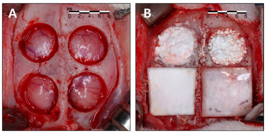 The rabbits were anesthetized with intramuscular injections of zoletil (15 mg/kg) and rompun (5 mg/kg) maintained with inhalations of isoflurane (2–2.5%). The surgical sites were shaven and then draped with alcohol and povidone iodine, followed by local anesthesia with 2% lidocaine. An incision was made along the sagittal midline from the frontal bone to the occipital bone. A full-thickness flap was elevated to expose the cranial bone. Four circular defects with a diameter of 8 mm were created using a trephine bur of corresponding size under copious saline irrigation, and randomly allocated to the four study groups (Figure 2). After surgery, the animals were managed by administering antibiotics subcutaneously (Baytril, Bayer, Leverkusen, Germany) and were closely monitored clinically during the entire period of healing. The animals were sacrificed at either 2 or 8 weeks postoperatively.