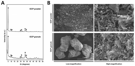 (A) The XRD spectra of the OCP powder (top) and granules (bottom). The OCP peaks are indicated by asterisks (*). (B) Representative high- and low-magnification FE-SEM images of the OCP power and granule.