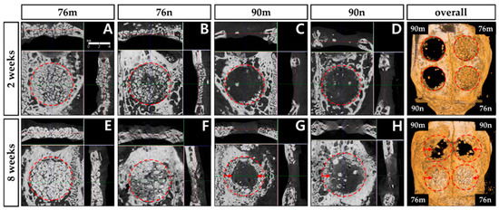 Micro-CT images obtained 2 and 8 weeks after surgery. New bone formation occurred mainly around the periphery of defect, and significantly increased at 8 weeks compared to 2 weeks in all groups. The red circle represents the border of the defect, and the red arrow indicates the direction of presumed new bone formation. (A,E) 76% OCP with a membrane group; (B,F) 76% OCP without a membrane group; (C,G) 90% OCP with a membrane group; (D,H) 90% OCP without a membrane group; (right top and down) three-dimensional reconstruction images.
