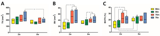 Distribution of experimental groups and statistical significance within groups according to micro-CT analysis results. Small and capital letters of the same alphabet indicate significant differences between 2-week and 8-week results compared in the same experimental group. Even though there is no significant difference, if a distinction is needed, a prime mark is used next to the letter. The asterisk * indicates statistical significance. (A) Total tissue volume, (B) new bone volume, (C) bone volume ration.