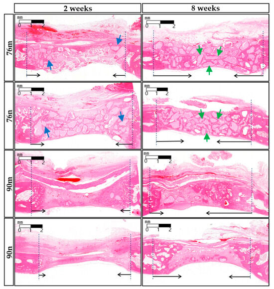 Representative histological images of each experimental groups after 2 or 8 weeks. (HE stain, bar = 1 mm) At 2 weeks, the new bone formation was observed around the grafted particles in the adjacent margin of the defect (blue arrows). At 8 weeks, however, new bone was observed not only growing from the marginal area but also around the centrally located remaining particles (green arrows). The border of the defect is indicated by black dotted lines, and the direction of new bone formation is indicated by black arrows.