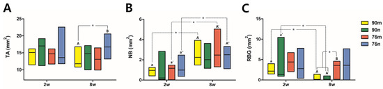Except for a significant difference between the 90m (11.755 mm2) and 76n (16.720 mm2) groups at 8 weeks, most of the TA results were measured consistently between the experimental groups as well as between the findings at 2 and 8 weeks. The overall median values representing TA in all groups were 14.890 mm2 for 2 weeks and 14.315 mm2 for 8 weeks. Statistically significant increases in NB and %NB were observed at 8 weeks compared to 2 weeks in all groups except for the 90n group. In all groups, the overall median values of NB increased from 0.975 mm2 for 2 weeks to 2.290 mm2 for 8 weeks, and the values of %NB, the ratio of NB to TA, increased from 5.985% for 2 weeks to 16.128% for 8 weeks. However, there was no significant difference between the experimental groups within the same period. On the other hand, RBG and %RBG showed a tendency to decrease more at 8 weeks than at 2 weeks, including statistical significance only in the 90n group. The overall median values of RBG and %RBG decreased from 2.405 mm2 and 15.3% for 2 weeks to 0.800 mm2 and 6.034% for 8 weeks, respectively. At 8 weeks, the RBG and %RBG of the 76m group (3.580 mm2/24.323%) were higher than those of the 90% OCP groups with a significant difference. The 76n group (3.615 mm2/21.968%) also showed higher RBG and %RBG than the 90% OCP groups, but there was no statistical significance due to large differences between animals. The results from the histomorphometrical analysis are summarized in Figure 7 and Table 2.