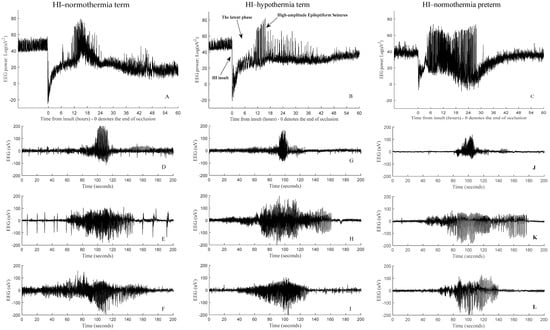 Examples of EEG power activity before, during, and up to 60 h after an HI insult induced by acute umbilical cord occlusion in an HI−normothermia preterm fetus (A), global cerebral ischemia induced by bilateral carotid artery occlusion in HI−normothermia term fetuses with no treatment (B), and HI−hypothermia term fetal sheep with 3 days of therapeutic hypothermia (C). The presence of high-amplitude stereotypic evolving seizures (HASs) during the secondary phase of recovery is demonstrated in (A–C). Examples of individual HASs from each fetal sheep in the above groups are shown in (D–L), respectively. HAS patterns above demonstrate examples of EEG epochs used in the training and testing of the proposed seizure detectors.