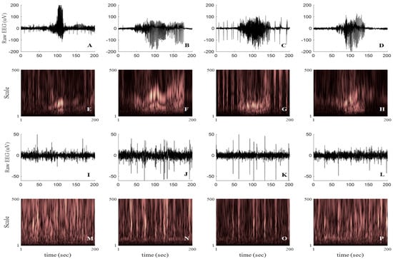 (A–D): Examples of post-HI high-amplitude stereotypic seizures (HASs) in all fetal sheep groups, equal to Figure 1D,E,K,L. (I–L): Examples of post-HI non−HAS EEG segments. (E–H) and (M–P): Examples of the corresponding scalogram images of the HAS and non−HAS EEG segments, respectively, used for training of the seizure detectors. The scalograms were generated using Morlet mother wavelet of scales 1 to 500.