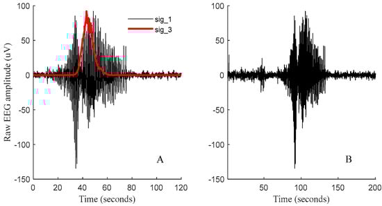 (A): sig_1: An example of un−-centered seizure (HAS) from preterm fetal sheep (10 h post−HI insult). sig_3: evaluated moving median absolute deviation (movmad) of sig_1 with an arbitrary sliding window size of length of 8000 points, scaled up to sig_1 for visualization. (B): Example of the final centered seizure (HAS) in a 3.34 min long EEG segment used in the training and testing of the deep net classifiers.