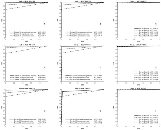 ROC curves and the corresponding AUC values from testing WS−CNN (A–C), WF−CNN (D–F), and 1D−CNN (G–I) seizure detectors in study #1, #2, and #3, respectively. The data for each proposed classifier are presented as mean ± SD, demonstrating improved accuracy and much lower variability when data from all fetal sheep groups have been used in the cross-validation results of study #3.