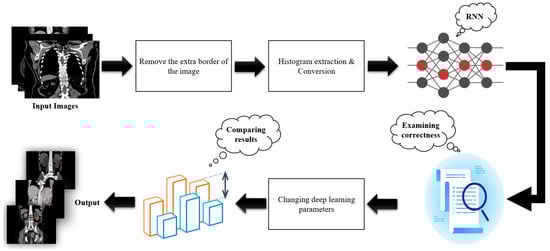 In this section, the theoretical details of the proposed method are given, along with the selection of its parameter values. Figure 1 shows the block diagram of the adopted methodology. Removing extra borders of the input image is a preprocessing step. The main steps of the methodology include the extraction of the input image histogram and the use of a Recurrent Neural Network (RNN). The selection of the correct asymmetric intervals in the histogram extraction and the use of the RNN model are novelties of the present study. Two blocks, namely for examining correctness and adjusting the DL parameters, were added to maximise the efficiency of the developed methodology. The final step involves the comparison and validation of the obtained results.