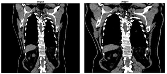 The border-cutting step seeks to expedite the further feature extraction by shrinking the input image and eliminating extraneous details. Figure 2 shows an original CT image and the corresponding one obtained after applying this procedure. With this processing, the dark margin of the input image is eliminated, and the image is reduced. Furthermore, because CT images contain many pixels with nearly 0 (zero) intensity values, removing these margin pixels decreases the severity of the histogram imbalance.