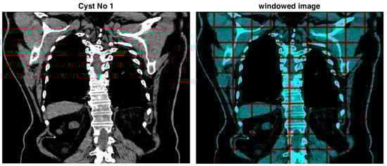 An asymmetric interval is taken onto the reference to find the normalised histogram of the regions in the cropped image. The reason for choosing an asymmetric interval for the histogram is the higher pixel density in the darker intervals of the input image compared with the lighter ones. This asymmetry is necessary to achieve an adequate separation in the statistical representation of the image’s pixels. A well-known weakness of the histogram is its global form. To solve this issue, windowing is performed, which involves dividing the input CT image into 100 windows with identical dimensions, i.e., ten intervals in width and height. An asymmetric normalised histogram is then built independently for each window. An eight-point histogram yields a feature matrix for the input image. Figure 3 shows an example of a windowed image.