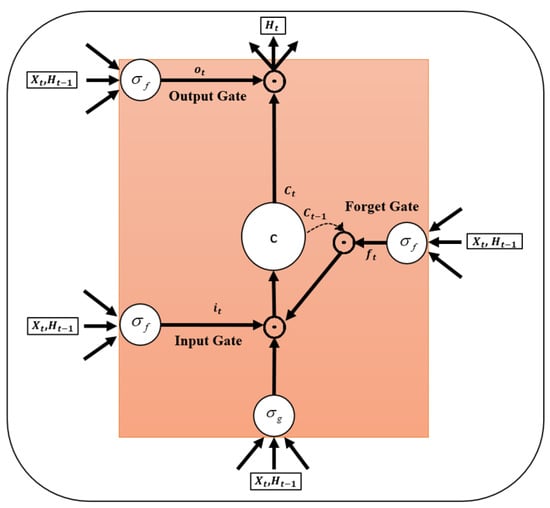 Each hidden unit maintains an internal state updated at each time step based on the input and previous state. Increasing the number of hidden units improves the model’s ability to capture complex patterns in the data but also increases the model’s computational complexity and training time. Typically, a combination of LSTM and dropout layers is used in the training phase to prevent overfitting. In the dropout layer, some units of the LSTM layer are randomly disabled during training, which means that they are not updated. However, during the prediction, all units are active. This approach effectively reduces the risk of overfitting. The LSTM layer can operate according to two output modes: sequence mode and last mode. In the first mode, the LSTM generates an output equal to the input length for each input sequence. This mode is often used for time series classification or forecasting tasks. In the second mode, the LSTM produces only one output for the entire input sequence, meaning that only the final response is provided. In addition, an LSTM has several other parameters that control its behaviour, including the gate activation function, weight initialisation, and weight regularisation. Overall, an LSTM is a robust layer for DL models. By incorporating memory cells and information flow-controlling gates, the LSTM layer can effectively capture long-term dependencies in the data while mitigating the challenge of minor sample effects common in traditional RNNs. The mathematical relationships of the LSTM structure shown in Figure 5 are as follows: