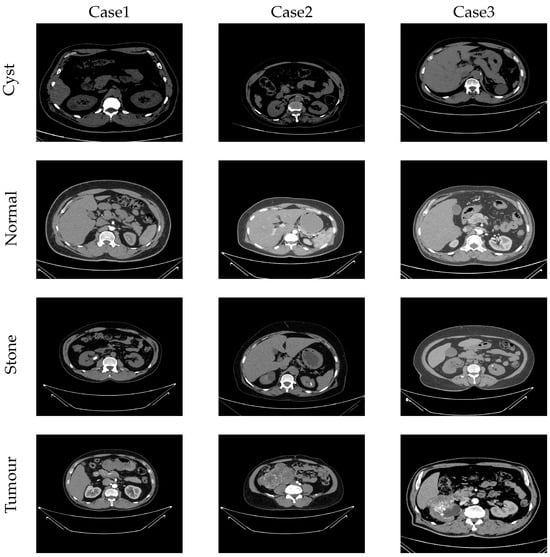 In this study, a dataset of kidney cysts, stones, and tumours [] was used, which includes images of healthy, cystic, stone, and tumour-affected kidneys obtained from the Picture Archiving and Communication System (PACS) and workstations of the Dhaka Central International Medical Hospital (DCIMCH), in Dhaka, Bangladesh, where the related data collection and experimental procedures were authorised []. According to the dataset description, the image headers, including patient information and various labels, were removed, and the DICOM images were converted to the JPG format. The Philips IntelliSpace Portal software, a standard tool for radiology equipment, was used to label the images. In addition, the DICOM images were converted to JPG format using the Sante DICOM Editor software. Finally, all images were reviewed and labelled by a physician []. The used dataset includes 12,446 images, Table 1. Examples of the images included in the dataset are shown in Figure 6, where the red delineations indicate disease issues. For this study, both coronal and axial sections from the CT images of the whole abdomen and urogram, acquired with and without contrast, were selected. The unequal number of samples across categories within the kidney dataset (Table 1) may affect the effectiveness of the method under study. To mitigate this effect on the learning process of the proposed method, approximately 70% (1000 samples) of the smallest category, namely the stone category, was used for training, while the remaining samples were allocated for testing. In addition, an equivalent number of data samples from the other categories was selected for training, which was equal to the training samples from the stone category. This ensured that exactly 1000 samples from each class were used in the training phase, while the remaining samples were assigned for testing (Table 1). Therefore, the used training set included 4000 samples, while 8446 samples were assigned to the test, which means that of the samples were assigned to the training and the rest to the test. Both training and test data were randomly selected.