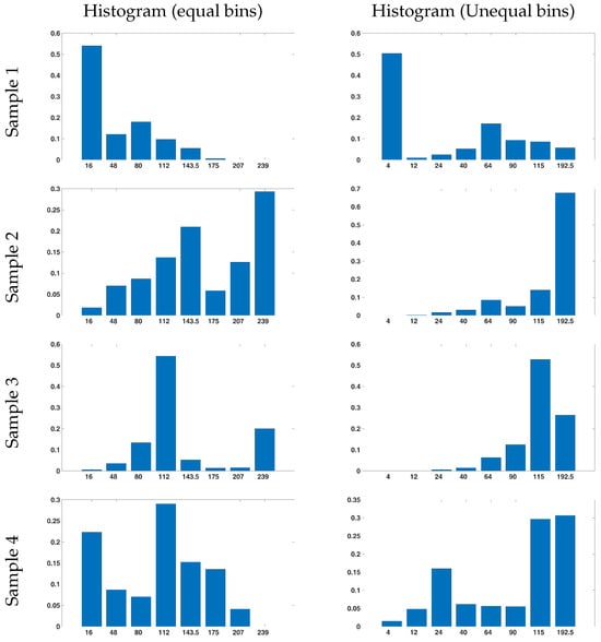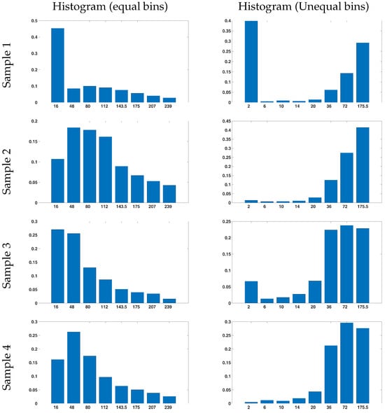 Compared with Table 2, the pixels are dense around 0 values and are widely distributed at higher intervals. To illustrate this, Figure 8 shows four gradient histogram examples in two standard and suggested intervals in a window with four different classes.