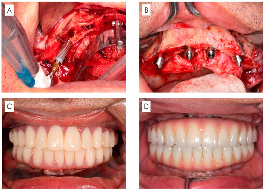 Surgical and prosthetic protocol. (A) Insertion of implants. (B) Placed implants and abutments. (C) Immediate loading with provisional restoration after operation. (D) Final restoration.