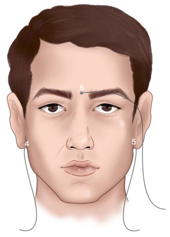 Reference sensors located at three points on the subject’s head: right mastoid skin point (4th), left mastoid skin point (5th), and glabella (6th).