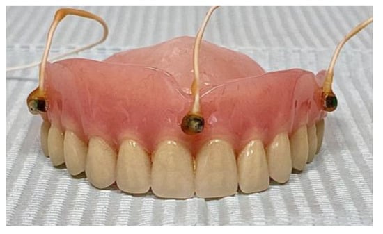 The world population growth rates, along with the extended life expectancy, may lead to an increasing demand for oral rehabilitation treatments []. Among the treatment possibilities for people with edentulism is rehabilitation with removable prostheses, and their adjustment is based mainly on their ability to resist displacement in the vertical (retention) and horizontal (stability) direction []. Many studies have reported that the quality of life of people after being treated with removable prostheses, whether total or partial, increased considerably in terms of improved chewing ability, smile aesthetics, and satisfaction with the state of their mouth after receiving conventional prosthetic treatment [,]. Within removable prostheses, there are muco-supported, dento-muco-supported, and implant-supported types; the last of these has been presented as an alternative to overcome the retention problems presented by the first two; however, it has been shown that this type of prosthesis also presents negative aspects, such as pain, marginal bone loss, and associated infections. These factors, added to the cost of treatments, justify the continued utilization of removable prostheses without implant support, the most used alternative [,].