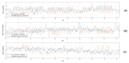 In orange is the mandibular sensor movement, and in blue is the upper central sensor movement. Both graphs are t-normalized. In the legend, the mean and the standard deviation of each one are shown. The Y axis legend indicates the movement direction. (a) Vertical movement; (b) anteroposterior movement; (c) transversal movement.