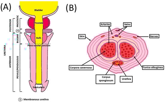 The human penis is the male organ of urination and copulation and is composed of an anterior and a posterior urethra (Figure 1A). It includes different tissues whose roles are critical to maintaining their functionality. Two dorsolateral corpora cavernosa are located side by side on the dorsal part of the penis (Figure 1B). Cylindrical in shape, they are part of the erectile tissues. They become engorged with blood during the erection phase, allowing the penis to stand up and maintain itself. The tunica albuginea is an extensible tissue rich in elastin fibers, which envelope the corpora cavernosa. By constricting the deep dorsal vein, blood cannot leave the penis, and the erection is maintained.