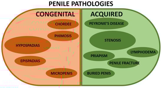 Pathologies affecting the urethra can be classified into two major groups: congenital or acquired [] (Figure 2). As previously discussed, penile development is a complex process starting during the fetal stage and pursuing until puberty with many involved critical factors. In addition, a significant proportion of genitourinary malformations affect the penis. Congenital and acquired anomalies of the penis usually involve anatomic abnormalities and aesthetic discomfort. In addition, surgical repair is needed when the function is impaired or cosmetic correction is desired. Several excellent reviews have been written and can be read with profit [,,,,,,].