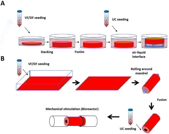 Schematic protocol of urethral substitute production by the self-assembly method (flat and tubular models). (A) Preparation of flat tissue (patch): The stromal cells are seeded on 6-well plates containing a paper anchor used to limit contraction and to facilitate tissue manipulation. A support stabilizes this anchoring. The cells are cultured in a medium supplemented with 50 μg/mL of ascorbate. On day 28, the sheets are detached from the plastic, and three sheets are superimposed to form a thicker tissue subjected to limited compression to allow the fusion of the cell sheets in 4 days. Then, the urothelial cells are seeded on the upper part of the construct and cultivated for seven days in submerged condition. The constructions are then raised at the air/liquid interface using a support for an additional 21 days to allow the epithelial cells to mature. (B) Diagram of the “tubular” model production by the self-assembly technique. Classic tubular self-assembly technique. The dermal fibroblasts are seeded in a cell culture plate covered with gelatin. They are grown for 28 days in the presence of ascorbate. The stromal sheet formed is tightly wound around a cylindrical mandrel. The resulting construction is cultivated for four days to ensure the fusion of the sheets. Once the fusion is complete, the mandrel can be removed, and the tubular structure can be perfused to be seeded with urothelial cells. The tube is matured in a bioreactor.