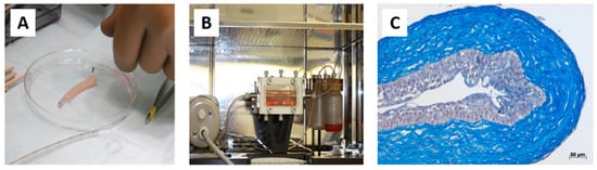 Based on the skin and blood vessel models reconstructed at LOEX, the use of the self-assembly technique has also been validated for the production of flat (Figure 4A) [] and tubular tissues (Figure 4B) [].