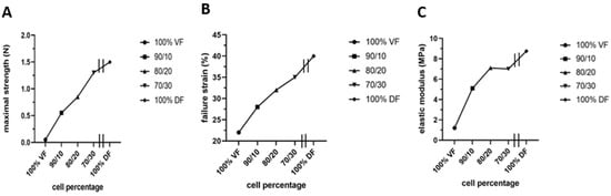 Characterization of the mechanical properties of the substitutes produced with different ratios of vesical or dermal fibroblasts. Each symbol represents the mean of measurements of one substitute. The 100% VF refers to the condition where the stroma of the urethra substitute was reconstructed using vesical fibroblasts (VF) only. The 90/10 is for a mix of 90% VF and 10% dermal fibroblasts (DF), 80/20 is for a mix of 80% VF and 20% DF, 70/30 is for a mix of 70% VF and 30% DF, and 100% DF is for the condition where the stroma of the urethral substitute was reconstructed using only DF. All the substitutes were produced using the hybrid technique of assemblage. (A) Maximal strength was measured using Instron ElectroPuls E1000 (in N). (B) Failure strain in (%). (C) Elastic modulus (inverse of elasticity) (in MPa).