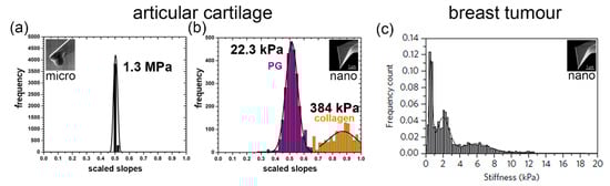 The micrometre-sized tip measures the stiffness of the tissue as shown in Figure 1a, but it cannot distinguish the fine-structural elements of the tissue. Only the nanometre-sized AFM tip can distinguish the different elements of the extracellular matrix when nanomechanically profiling tissues, as shown in Figure 1b,c. IT-AFM reveals two separate peaks in cartilage, one for the proteoglycan moiety and one for the collagen meshwork [11,12], while the nanostiffness profile in the structurally more complex tumour structures reveals a more multifaceted nanostiffness distribution [14,15]. As the disease progresses, these profiles alter and provide information of the disease progression that can be subsequentially monitored.