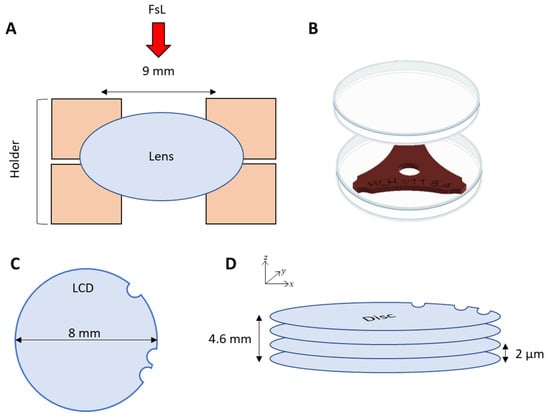 Lens holder principle and femtosecond laser pattern. (A) Schematics of the human lens holder used to maintain and cut the anterior lens capsule disc. The opening of the support, which is equal to 9 mm, allows a laser cutting of 8 mm in diameter. (B) Human lens holder included in a sterile Petri dish to maintain sterility. (C) FsL pattern with a disc of 8 mm and 3 asymmetrical circular marks (2 in a row and 1 faraway). (D) Graphic of the cutting parameters with an inter-disc distance of 2 µm and a total height cut of 4.6 mm.