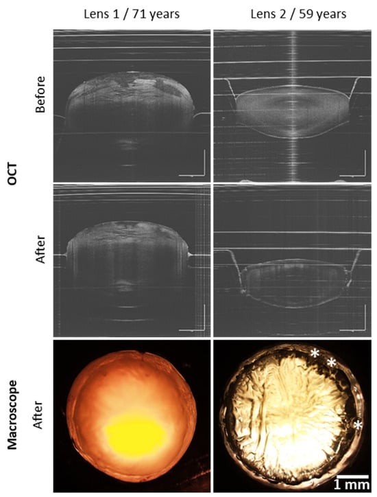 Representative examples of 2 lenses before and after femtosecond laser cutting of an 8 mm diameter disc. Optical coherence tomography (OCT) acquisition before and after femtosecond laser cutting showed good lens stability during the process. Retro-illuminated pictures allowed verification of the correct centration before manual dissection and showed the 3 circular marks (*).