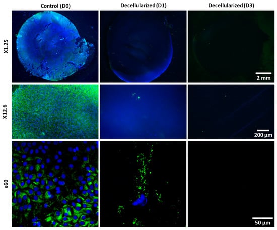 Efficiency of decellularization in water. Cells residues were stained with DiOC6 (cytoplasm, in green) and DAPI (nuclei, in blue) staining. Representative examples after 1 and 3 days of immersion in water, versus control. Images were taken at a magnification of ×1.25 for the whole capsule, ×12.6 for the zoom, and at ×60 for cell resolution.