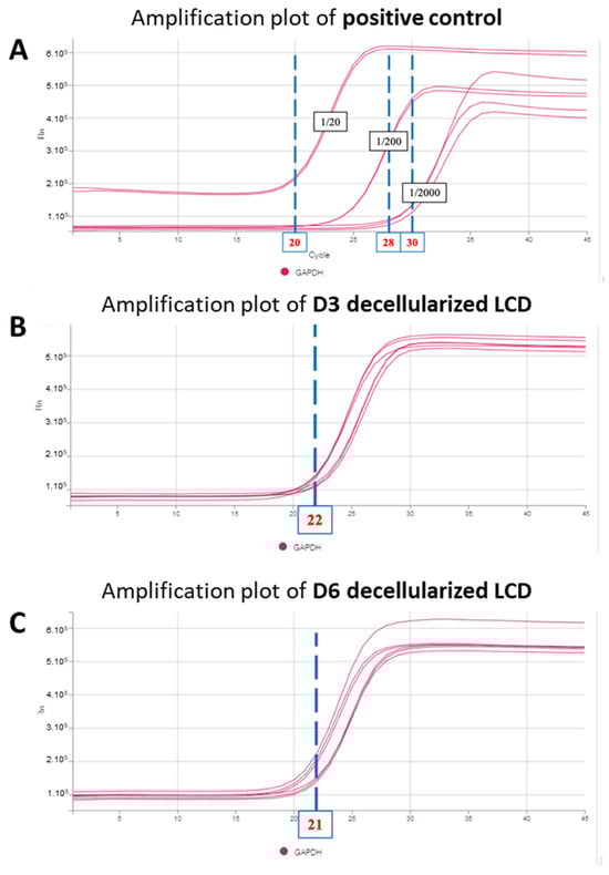 The minimal number of PCR cycles observed for the DNA amplification was 20 for the most concentrated control, i.e., 1/20 (and 28 and 30 for the positive controls at 1/200 and 1/2000 cell dilution). For non-decellularized capsules, DNA amplification was detected after 26 cycles (Figure 5A). For capsules decellularized for 3 and 6 days, DNA detection was observed at 22 and 21 cycles, respectively (Figure 5B,C).