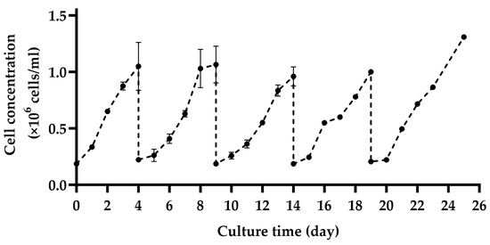 Figure 2 illustrates the reproducibility of five instances of in situ cell detachment and colonization of MA 104 cell line on Cytodex 1, following the method outlined in Section 2.3. As shown, after each in situ cell detachment and subsequent colonization of the MCs, the cell concentration reached a peak at an average of 1.1 × 106 cells/mL within 4–5 days of culture. In Figure 2, the cells were cultivated in shake flasks for the initial four days. However, the following cell growth represents cells harvested through in situ cell detachment by Trypsin EDTA solution. Hence, the specific cell growth for the initial four days on MC is higher. Yet, there were no notable differences in the final cell numbers achieved after 4–5 days. The result shows that MA 104 cells can undergo multiple cycles of detachment and resettling on Cytodex 1 without changing their growth behavior. Images in the supplementary materials (Figure S2) show optical and fluorescent microscopic observation of the cells on MCs as exemplary of MA104 cell growth on MCs after undergoing multiple in situ cell detachments.