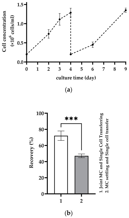 (a) Cell growth trend upon exclusive transfer of single cells after in situ cell detachment and (b) total cell recovery from two methods of jointly transferring cells and MC or only transferring the single cells after MC settling (p ≤ 0.001: ***).