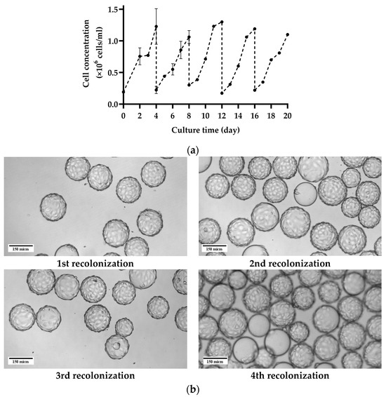 Figure 4a demonstrates the Cytodex 1 microcarrier’s capability to support repeated recolonization by MA 104 cells. Results show that after each recolonization, an average cell density of over 1 × 106 cells/mL was achieved within 4 days of cultivation, with consistent cell growth across multiple in situ cell detachment cycles. As illustrated in the graph, the initial seeding density at each recolonization was between 150,000 and 300,000 cells/mL. Achieving reproducible seeding density proved challenging, resulting from the need to remove excess cells during MC settling after complete cell detachment, thereby increasing cell loss due to cells settling with the MC. Images in Figure 4b show optical microscopic observations of MA 104 cells on Cytodex 1 on the 4th day of culture in each recolonization. The observations confirm the monolayer growth of MA 104 cells on the same spent Cytodex 1 after each recolonization cycle. Notably, observed cell aggregation on Cytodex 1 was minimal, occurring on less than 6% of the total MCs.