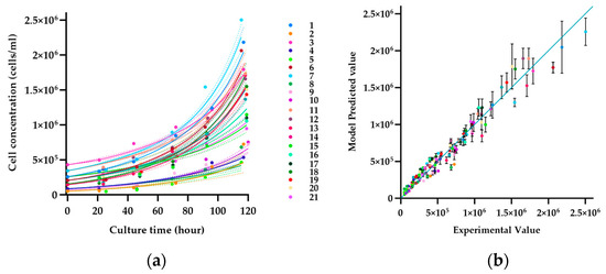 Figure 5a,b indicate the predictive performance of the hybrid model developed according to Section 2.10.3. It predicts the total cell concentration during 5 days of culture based on the selected process parameters in different runs (see Supplementary materials, File S1 and Table S1). The responses of cell growth to the different process parameters (colored squares) as well as the modeling accuracy are depicted (difference between solid lines and colored squares). It is visible that the processes resulting from the chosen input parameters differ significantly, yielding between 0.5 and 2.5 × 106 cells/mL at the end of the culture. The hybrid model could describe the behavior accurately over the full-time course with a root mean square error (RMSE) of 92,705.18 cells/mL. Thus, the model could illustrate in detail the propagation of cells over the full process duration, taking into account the three different input parameters.
