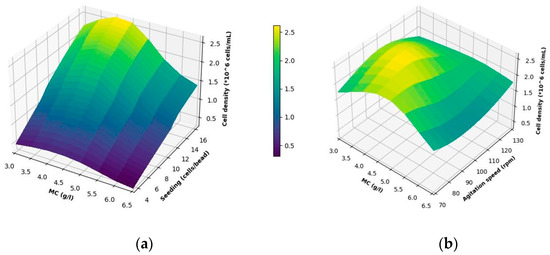 For the parameter of seeding density (Figure 6a), a maximum cell concentration of 2.6 × 106 cells/mL was predicted at the highest seeding density of 16.7 cells/bead at MC concentration and agitation of 4 g/L and 95 rpm, respectively. Based on the outcomes of this DoE study, described by the digital twin (Figure 6a,b), going further to higher cells/bead ratios should be considered to aim at achieving an even higher cell concentration at the end.